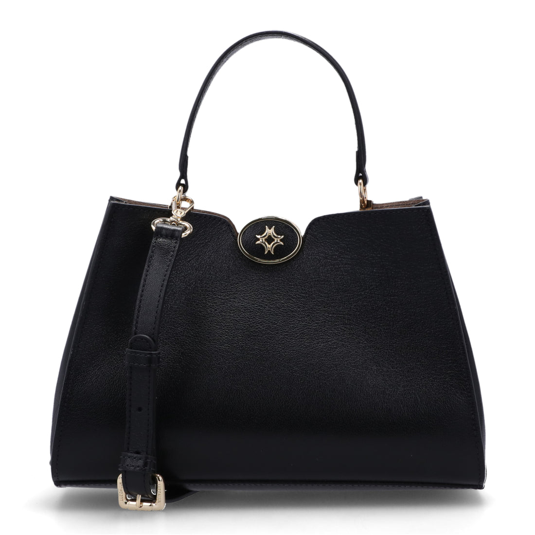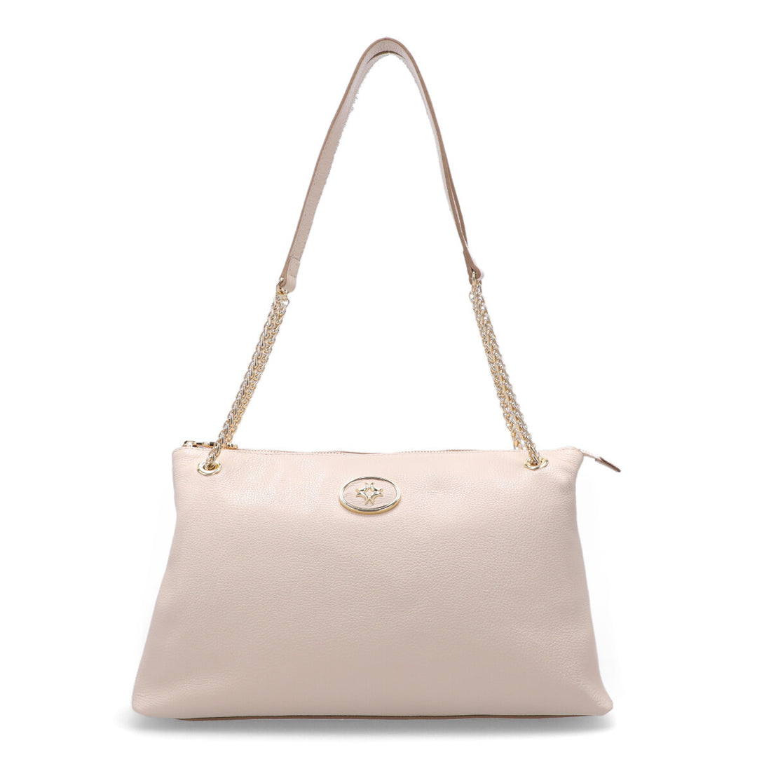 Cierre principal con botón magnético. Asa de mano de cadena fija y correa con regulación...