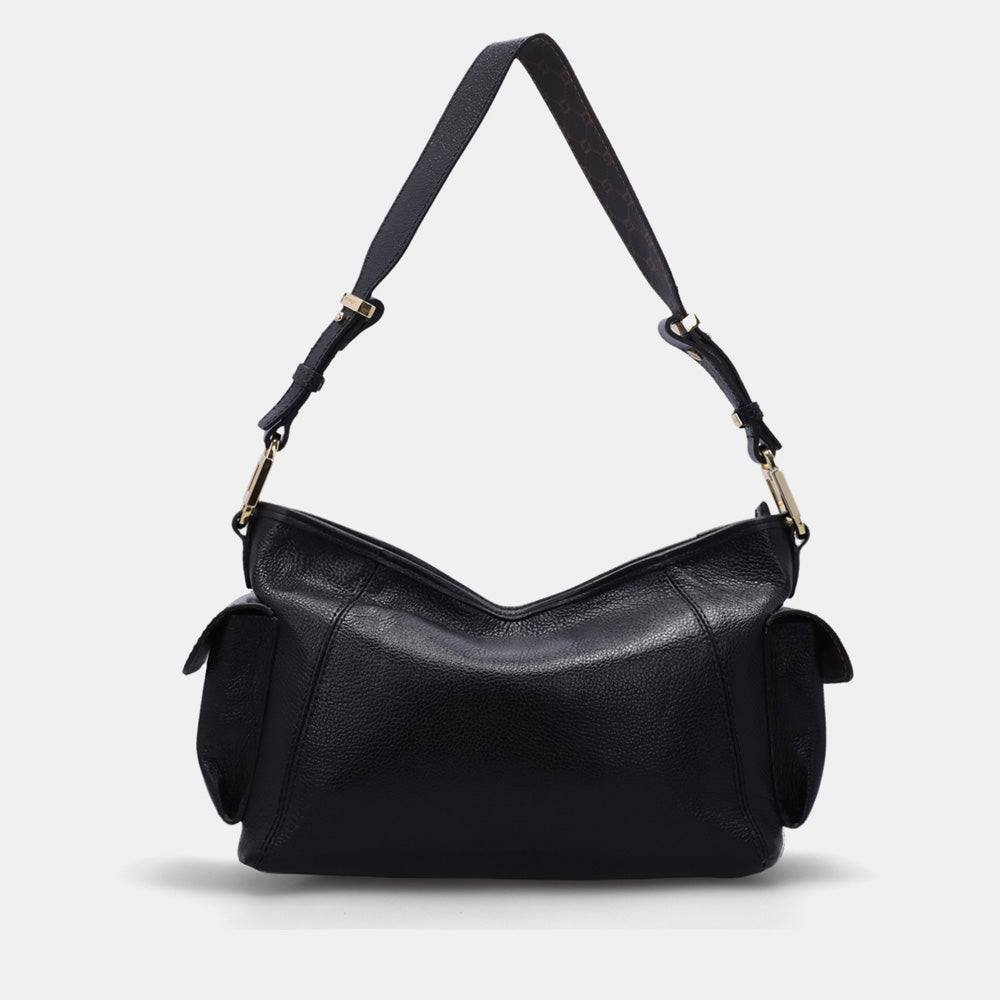Cierre principal con botón magnético. Asa de mano de cadena fija y correa con regulación...
